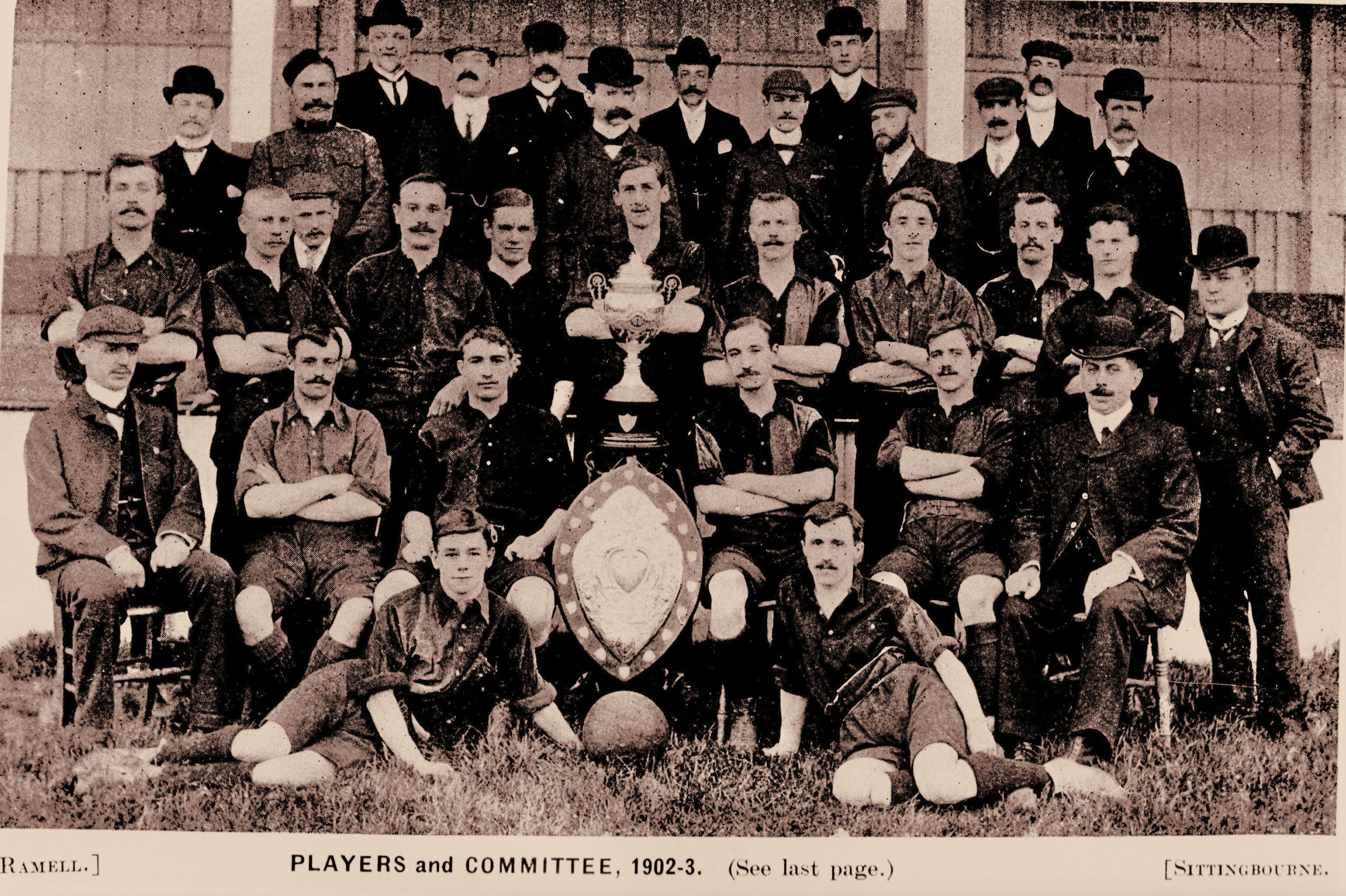 The double winning side of 1902-1903 pose with Kent League and Senior Kent Cup trophies: courtesy of Sittingbourne FC
