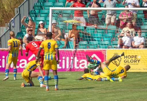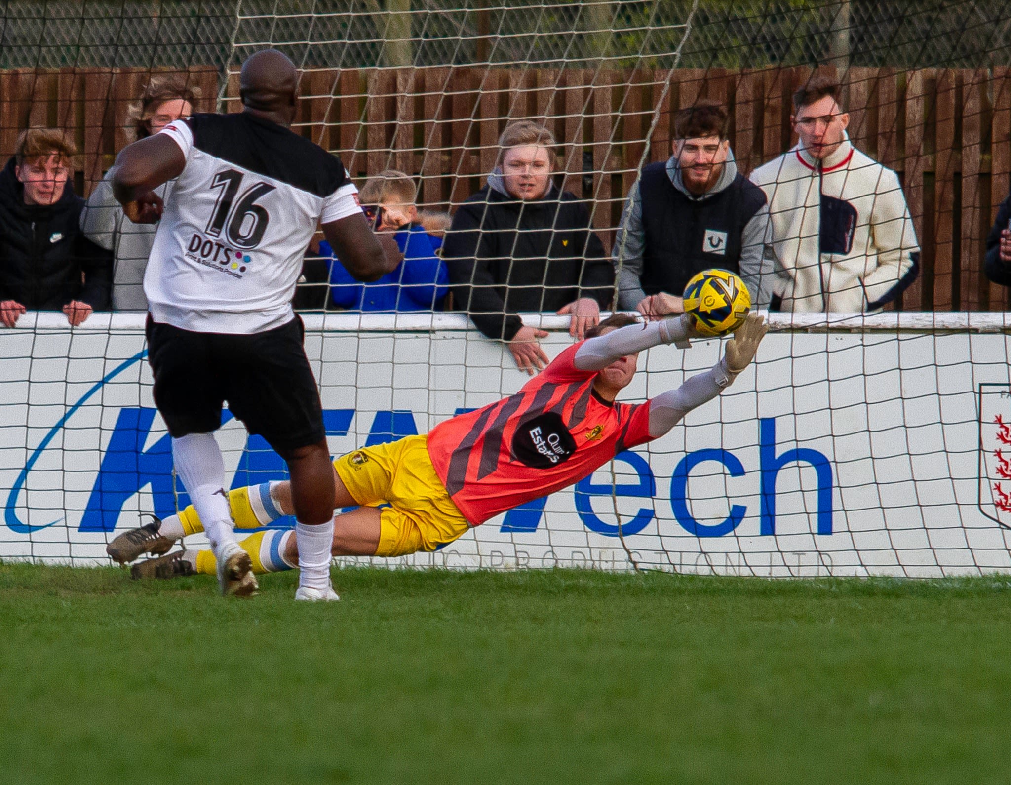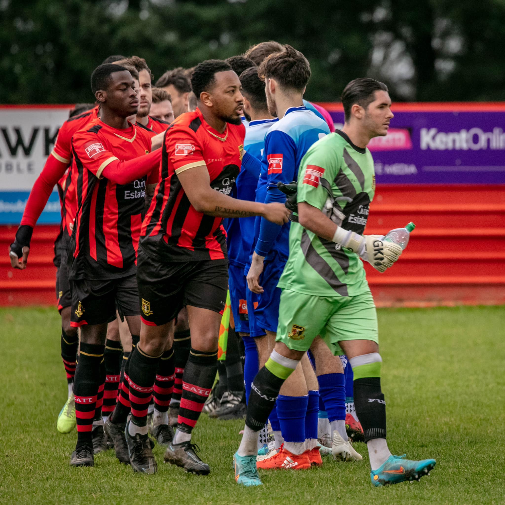 In a hard-earned win against local rivals Faversham Town Joe Tyrie's 38th-minute goal is overshadowed by makeshift goalkeeper Harrison Ponts' (who is usually a center-back) late penalty save from the 'Beast' Adebayo Akinfenwa.